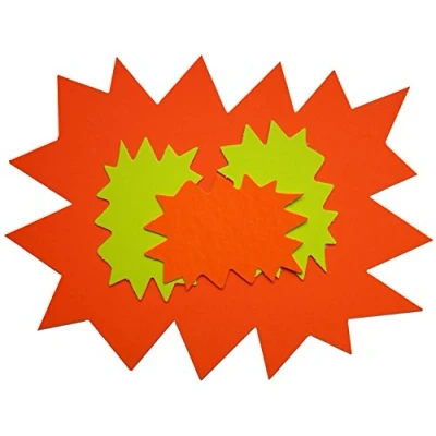 Cartón fluorescente de 780 g/m², borrable en seco, una cara amarilla fluorescente y una cara naranja fluorescente Uso manual con marcadores, letras transferidas o adhesivos Muy visible, estas etiquetas de forma fragmentada permitirán destacar una promoción
