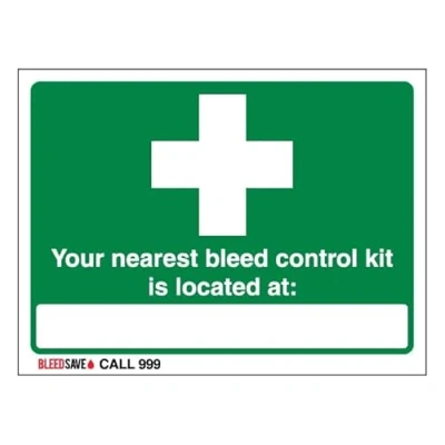 Bleedsave Señal de seguridad compuesta aluminio cepillado 3 mm con texto en inglés "The Nearest Bleed Control Kit Is Located Call 999 200 x 150
