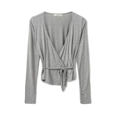 SneakinBlusa de manga larga cruzada.Tejido elástico con una fina estructura acanalada.Diseñada con un cuello en V y una banda de tela en la cintura.Calidad: 90% Viscosa, 10% SpandexDimensiones: EstándarInstrucciones de lavado: lavado suave a 30 grados