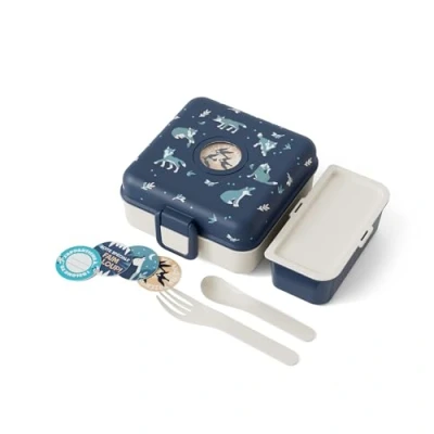 TuteteEscuela, vacaciones, picnics o salidas escolares: la caja para meriendas MB Snacky Azul Wolf de Monbento, se mete en las mochilas de los más traviesos.Formato compacto y plano para facilitar su transporte, práctico cierre que permitirá que las manos de los peques la abran y cierren fácilmente. Además, podrás personalizar la tapa con 4 diferentes etiquetas que incluye. Debajo de la tapa se esconden un tenedor y una cuchara y cuenta con una cajita extraíble con tapa para separar alimentos. CaracterísticasComposición: recipiente y tapa PP, junta de siliconaIncluye tenedor y cuchara de PLA, 1 cajita extraíble con tapa de PP y 4 discos para personalizarlaMedidas: 16 x 14.5 x 7 cmCapacidad: 0.85 litrosPeso: 277 grResistenteApto para el lavavajillasSe puede usar en microondas con la tapa levantadaNo contiene BPAA partir de 4 añosAunque cierra bien de manera que evita que entre aire o salga líquido, no es un producto apto para llevar líquidos pues podrían ocurrir pequeñas fugas cuando está cerrado