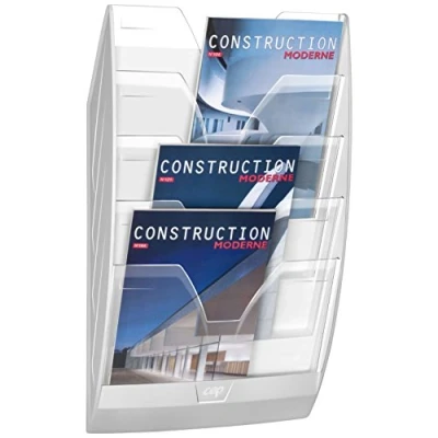 Expositor de pared ,5 separadores transparentes para una buena visibilidad, perfecto para organizar o presentar documentos, revistas Clasificador de pared con 2 imanes potentes que permiten aguantar una carga de 7 Kg Para formatos A4 y 24x32 cm Apertura grande para un fácil en forma de V acceso a los documentos PS alto impacto, 100% reciclable - Dimensiones : 35 x 12,8 x 58 cm