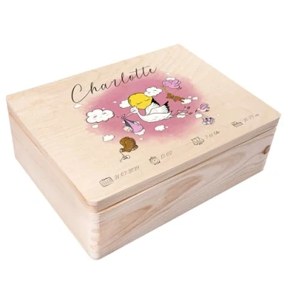 Creative DECO Caja de Recuerdos Personalizada para Bebés/Regalo Nacimiento Personalizado Cigüeña Rosa Cajas Madera Personalizadas Niños Personalizados Niño y Niña