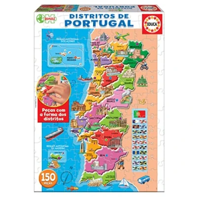 Puzzle 150 peças do mapa de Portugal e os seus distritos Conhece os distritos de Portugal com este divertidíssimo puzzle de 150 peças. Aprende os nomes dos distritos e das suas capitais. Conhece os monumentos mais característicos de cada zona, para além das respectivas bandeiras. Peças com a forma dos distritos. Tamanho aproximado do puzzle montado: 48 x 34 cm., Fabricante: Educa