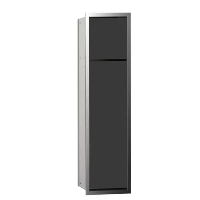 Espacio de almacenamiento invisible: el armario de baño empotrado ofrece un práctico espacio de almacenamiento sin ocupar espacio en el cuarto de baño y es especialmente fácil de instalar. Diseño funcional: el cuerpo de aluminio duradero, el práctico dispensador de papel higiénico y la función "Push to Open" hacen que la estantería de baño sea tu pieza favorita. Aspecto de alta calidad: la parte frontal de cristal dividida en negro es un discreto punto de atracción y se integra perfectamente en el cuarto de baño gracias a su montaje a ras de la superficie y su aspecto sin mango. ASIS 150: la serie modular ASIS 150 se caracteriza por sus productos ultrafinos que mejoran cualquier cuarto de baño con frontales brillantes y crean un valioso espacio de almacenamiento. Dimensiones y detalles: Eco ASIS 150 – Armario de baño empotrable para papel higiénico y escobillero – 2 puertas frontal de cristal en color negro – Dimensiones: 16,8 cm x 65,4 cm x 15,3 cm (ancho x alto x profundidad). Referencia 974027940.