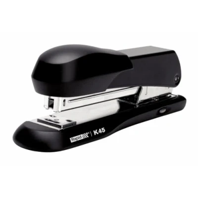 Grapadora para hasta 20 hojas de papel de 80 g/m² para uso frecuente en el hogar, la escuela y el trabajo, usa grapas 24/6 o 26/6 Grapas de grapas: 24/6 y 26/6 grapas (6 mm Longitud de pierna) para grapar hasta 20 hojas de papel de 80 g/m² Ahorro de espacio: se adapta en cada mesa y la mayoría de cajones gracias a su tamaño compacto, pies antideslizante no Mark muebles 5 años de garantía, apertura superior para una fácil recarga quitagrapas, patentado botón pulsador, yunque giratorio permite un grapado abierto o cerrado Contenido: una grapadora Rapid K45, negro, 23888200, (W x H x D): 66 x 48 x 170 mm), Peso: 323 g