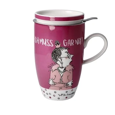 Muy bonita taza de té con tapa y colador de la marca Goebel de la colección Barbara Freundlieb La taza se ha fabricado con el título «Ich muss gar nix aus Fine Bone Chin» Diseñado con gran atención al detalle, hecho a mano, un regalo ideal Apto para lavavajillas, pero para preservar el brillo de los colores, se recomienda lavar a mano con detergente suave Las dimensiones son: 11,5 cm x 8 cm x 14 cm