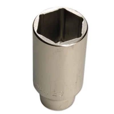 Size: 27mm single Hex x 1/2"D. Deep socket, depth: 77mm. Hex (6pt) head drives from the flats to provide more torque, ideal for damaged or seized nuts & bolts. Manufactured from chrome vanadium with a polished finish. Part of a range of deep sockets available individually. For other sizes, please see Laser Part Nos. 1982 - 1996 (10mm to 31mm).