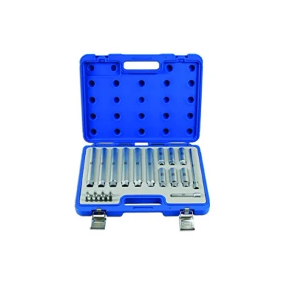 Twenty four essential tools for repairing and replacing shock absorbers. Six long sockets (80mm): 16, 17, 18, 19, 21 and 22mm; 6 extra long sockets (180mm): 16, 17, 18, 19, 21 and 22mm. Two 3/8"D adaptors: 90 and 190mm long. Six bits x 30mm long: Hex: H5, H6, H7, H8 and Star*: T50; Spline: M10. Four nut drivers: Hex: H10 and metric: 5mm, 6mm and 8mm. Set manufactured from Chrome Vanadium and the bits manufactured from S2 material.