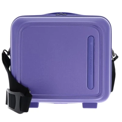 Beauty case rigido in policarbonato con organizzazione interna, tracolla regolabile e removibile e smart sleeve posteriore per l'aggancio alla valigia.
