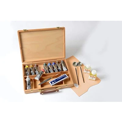 Caja Estudio en haya, con asa de piel, paleta y separadores de madera Colores producidos con total ausencia de ceras o adulteraciones en la formulación Colores idóneos para cualquier tipo de aplicación: espesor o veladura Todos los colores de la gama están dispersos en aceite de linaza purísimo, que permite un rápido secado Consistencia mantecosa, aplicación rápida