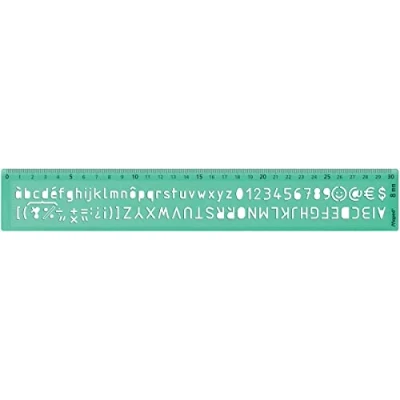 La plantilla de letras Maped incluye letras mayúsculas y minúsculas, números y símbolos. También incluye una regla de 30 cm en un lado. Son prácticas para escribir con precisión en artículos como placas de identificación y etiquetas. La altura de la letra es de 8 mm.