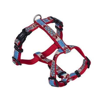 Nailon con estampado. Ajustable sin niveles. Contorno de pecho: 25-35 cm.