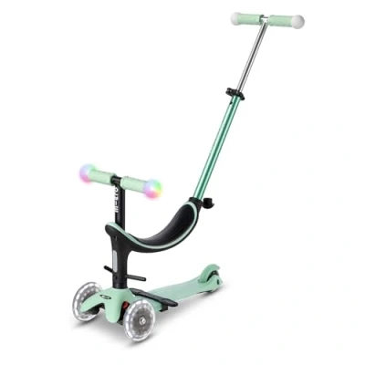 - Mi primer patinete Micro: Cuando el pequeño esté listo, se le puede retirar el asiento, transformando la barra de dirección en un manillar ajustable para un primer patinete. Este modo incluye ruedas luminosas y un freno trasero resistente, lo que asegura una experiencia segura y divertida.