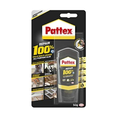123tintaEl pegamento multiusos Pattex Repair 100% ofrece un fuerte poder adhesivo para una unión permanente. Con el adhesivo multiusos podrás unir todo tipo de materiales, como madera, telas, plástico, vidrio, metal, yeso y azulejos. También es posible pegar superficies húmedas. El adhesivo multiusos flexible es resistente al agua y a temperaturas extremas, lo que lo hace adecuado para uso tanto en interiores como en exteriores.