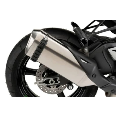 Este accesorio resulta muy práctico ya que protege una de las piezas de nuestras motos más expuestas en caso de caída Ligero, está fabricado con una base de silicona, que aguanta las elevadas temperaturas del escape y amortigua el impacto, y unos rodillos de poliamida que permiten el deslizamiento en caídas dinámicas Se puede montar a modo de abrazadera alrededor de cualquier tubo de escape, independientemente de su forma, mientras que el silenciador tenga un desarrollo entre 170 mm y 600 mm Puig dispone de recambios de los rodillos de poliamida para poder reemplazarlos en caso de desgaste producido por la abrasión ante una caída Consultar compatibilidad con su motocicleta en el apartado descripción del producto