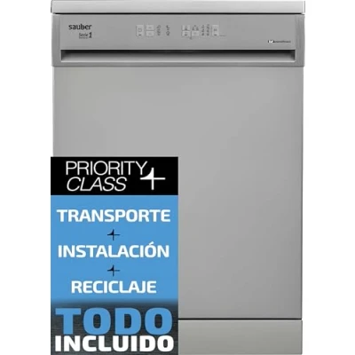 Sauber Priority Class: ENTREGA, CONEXIÓN Y RETIRADA DEL USADO EN SU DOMICILIO INCLUIDO CONTROL A PRIMERA VISTA INDICADORES LED Con indicadores LED de Encendido/Apagado, Pausa/Inicio, Programas, Sal, Abrillantador, Fase de lavado. SE ADAPTA A TUS NECESIDADES INICIO DIFERIDO Puedes retrasar el inicio del programa 3-6-9 horas. Para que esté en marcha a las horas de menos coste de la electricidad, aunque estés fuera de casa. OPTIMIZA EL ESPACIO CESTA SUPERIOR REGULABLE La cesta superior se puede regular en altura lo que permite optimizar el espacio, colocando recipientes de mayor tamaño en la bandeja inferior si lo necesitas. › Libre instalación › 12 Cubiertos › Clase E › Inicio diferido 3-6-9 horas › Cesta superior regulable en altura › 60 cm › Color blanco o inox 5 programas, Color: Inox, Dimensiones (mm) Alto 850 x Ancho 598 x Fondo 598