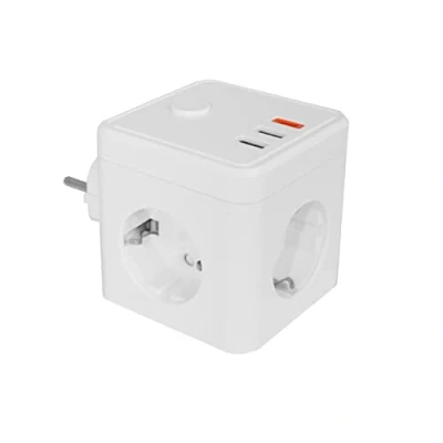 Enchufe con 3 tomas de corriente y 3 puertos USB. la función de carga del e-Block enchufe inteligente admite un dispositivo 3.1 A carga rápida. El e-Block mide 76,5 x 76,5 × 76,5 mm es lo suficientemente pequeño para una mochila o maletín e ideal para el hogar, la oficina y los viajes. La base ecléctica digital cumple con todas las normativas de seguridad y garantía CE. Botón ON-OFF Ahorro energía // Corriente 10A // Voltaje 250V~ // Potencia 2.500W.
