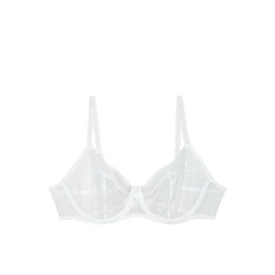 Un sujetador seductor que sostiene bellamente los senos. Los detalles que enamoran: un sujetador con aros en forma de copa que favorece, asegurando una cobertura perfecta de los copas de encaje floral y tul rayado, un cierre en la espalda todo en tul rayado que sugiere la piel, y tirantes de sujetador decorados que se ajustan a lo largo de toda su longitud.