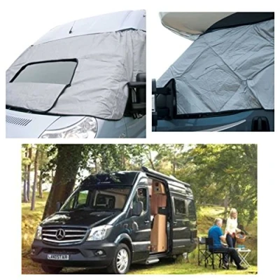 Mercedes Sprinter 06 on 2 juego de piezas que cubre ventanas delanteras y laterales Bolsillo transparente para permisos o publicidad Se adapta con correas elásticas gruesas. 5 cordones elásticos con ganchos y palancas, 2 cordones elásticos con ganchos y botones de resorte y correas elásticas gruesas en la esquina superior de las puertas delanteras. Las persianas cubren las 3 ventanas delanteras de tu furgoneta