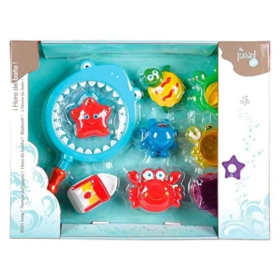 Set de juguetes de baño compuesto por una red de pesca con forma de tiburón con una gran boca con la que atrapar los 8 accesorios que vienen en este set Los accesorios que completan el set de pesca son 7 animalitos marinos con diferentes funciones para coger y mover el agua y una barquita pesquera; Todos los accesorios están hechos de material suave y de colores llamativos El agarre de la red de pesca tiene forma ergonómica para facilitar que el niño pueda sostenerlo y que a pesar de estar mojado no se le resbale de las manos; De esta manera el objetivo de pescar todos los animalitos y accesorios es divertido y fácil Se trata de un juguete seguro y suave con el que la hora del baño se convertirá en un momento divertido y lleno de aventuras en el agua, Fabricante: CPA TOY GROUP TRADING S.L.
