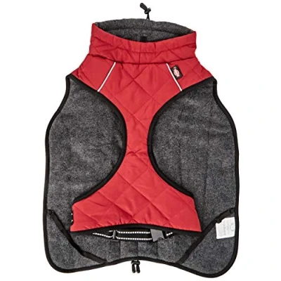 con dos cremalleras impermeables: una en el cuello para enganchar la correa, la otra en la parte trasera para unir al arnés con forro suave de felpa y acolchado tira del abdomen con hebilla, ajuste continuo cuello extra alto bandas tubulares reflectantes