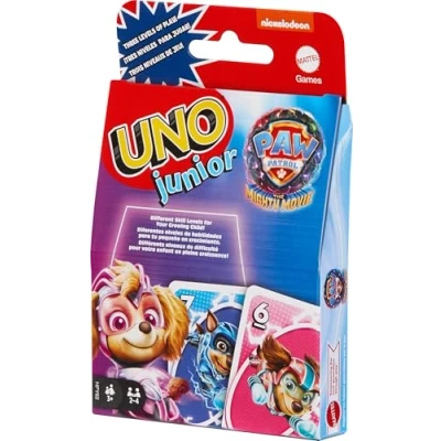 El juego UNO Junior que los jugadores conocen y adoran incorpora ilustraciones inspiradas en los personajes de la película “La Patrulla Canina: La superpelícula”. Se juega igual que al clásico juego de cartas en el que los jugadores emparejan colores y números para deshacerse de todas sus cartas. Los tres niveles de juego permiten a los más pequeños aprender a jugar poco a poco. Cuando te quede una sola carta en la mano, tendrás que gritar “¡UNO!”. Diseñado para que jueguen de dos a cuatro personas a partir de 3 años, este juego de cartas infantil es un regalo ideal para los fans de “La Patrulla Canina“ y de los juegos de cartas., Fabricante: Mattel