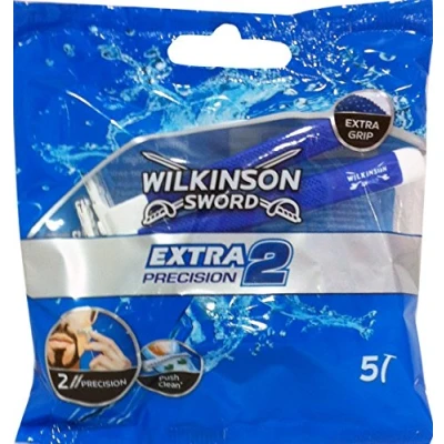 Bolsa de 5 maquinillas desechables de doble hoja Wilkinson Extra 2 Precision 2 hojas ultradelgadas para una afeitado facil y preciso en las zonas mas complicadas Con sistema Extra Grip: Mejor agarre en cada pasada Con sistema de limpieza Push-Clean para despejar la acumulación entre cuchillas Ideal para el perfeccionamiento de patillas y bigote Mayor comodidad por su mando de caucho antideslizante, banda lubricante y fácil limpieza Micro-Cabezal para fácil acceso a zonas difíciles Ideal para un afeitado suave y apurado de hombres con la piel sensible Las maquinillas Wilkinson están diseñadas para lograr un afeitado de alto rendimiento utilizando la última tecnología Con la garantia de calidad de Wilkinson Sword