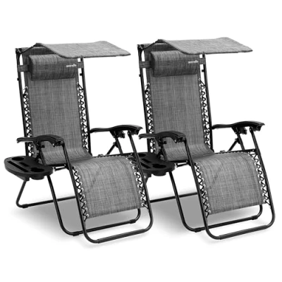 Zero Gravity Lounge Chair, Adjustable Steel Mesh Recliners, with Canopy, Removable Pillows and Cup Holder Side Tables, Set of 2, Gray